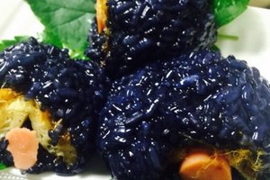 把洗净的糯米泡入乌树叶汁水中,放入冰箱冷藏过夜,浸泡10-12小时。浸泡好的糯米,倒出多余的汁水,入锅隔水蒸30分钟左右至全熟,出锅前关火再焖5分钟,即可食用。